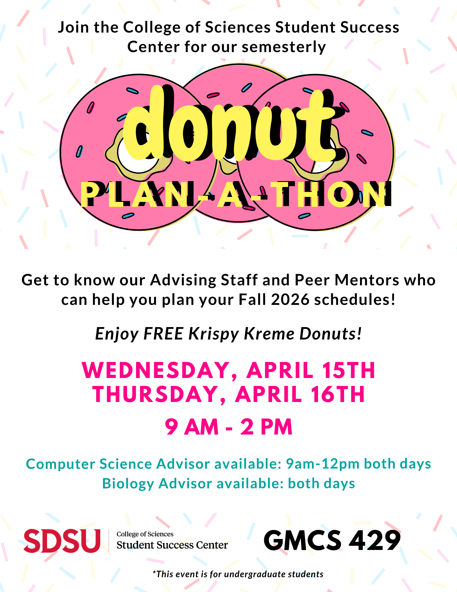 Undergraduate students are welcome to attend and get to know our Advising Staff and Peer Mentors who can help plan your Spring 2026 schedules. Enjoy FREE Krispy Kreme Donuts!